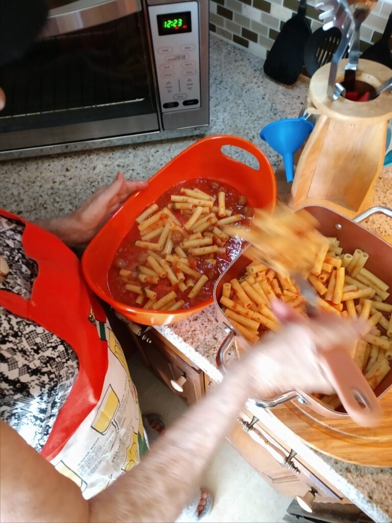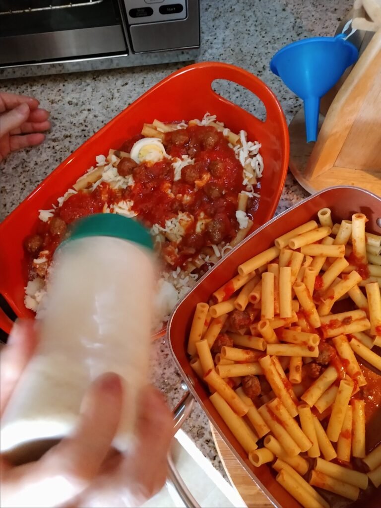 1 lb. cooked ziti, hard boiled eggs sliced, tomato sauce precooked with mini-meatballs, mozzarella cheese shredded, pecorino romano or parmigiana cheese grated. The cheeses can be purchased already shredded and grated.